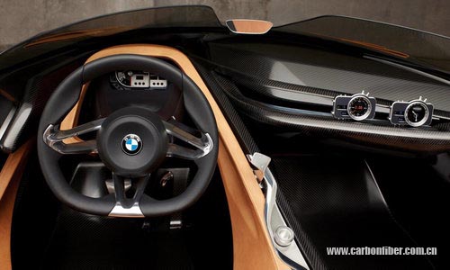 这款车的蓝本是今年的3月份在瑞士日内瓦国际车展上面曾经现身的Vision Connected Drive概念车。这款车展示了下一代宝马的设计理念和最新研发的驾驶信息显示系统,相关的设计和技术将在量产版的Vison Efficient Dynamics和MegaCity EV上得到应用。我们可以说,宝马328 Hommage可以是19世纪30年代的典型跑车宝马328的复刻版。宝马328被称作是上个世纪30年代最成功以及外观最美的一款跑车,而这款车的成功又归结于自己的设计参数,主要的特点是重量比较轻,采用了碳纤维(Carbon Fiber)元素进行打造。CFRP碳纤维增强复合材料(Carbon Fiber Reinforced Polymer)曾经使用在F1赛车的很多部件上面,并且也被广泛运用于军事,航空,体育用品,工程中,如桥梁加固、维修等等。这样做的结果就是车子的重量仅有780公斤,这一数字可以说是相当的惊人。