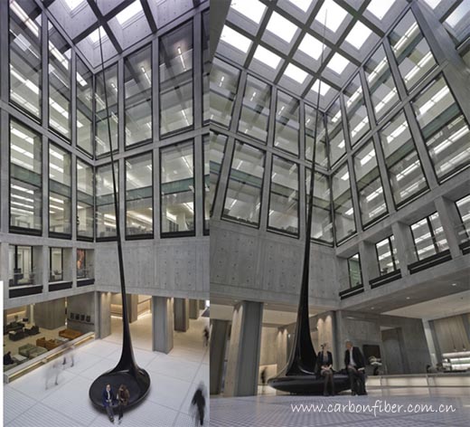 设计师同时希望这个流体形状也与建筑发成强烈对比。这个形状是一个真正的进程,而不是单纯的创造结果。回忆蜜糖的从勺子上优雅的滴落吧。因为材料用的是强度大,重量轻的碳纤维,设计师与工程师经过分析后,使得这件22米长的作品,受力直径仅需100mm,而尖端的造型做到25mm。