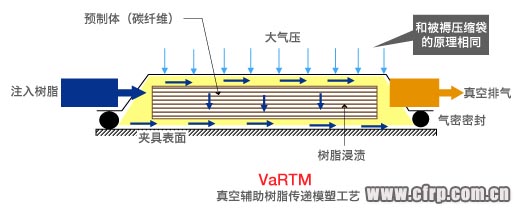 VaRTM工艺示意图。优势在于无需高额的设备投资,可低价制造