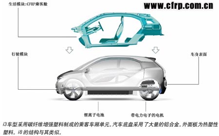 为了抵消锂离子电池组带来的重量负担,公司决定车型的整个乘客舱结构用更加坚固、轻质、耐腐蚀的碳纤维增强复合材料成型。碳纤维乘客舱单元——密度只有铝的一半,比钢铁轻50%——将与大量采用铝合金材料的底盘相匹配,而车身外部面板将使用热塑性塑料。