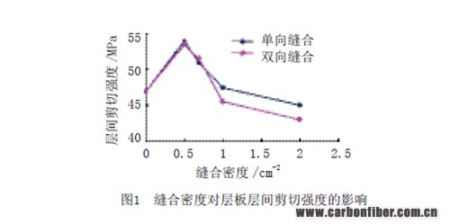 缝合密度对缝合复合材料层间性能影响很大,冲击试验研究表明缝合密度增大,复合材料分层损伤面积减小,密度增大4倍,分层减少40%[15]。但缝合的同时,缝针、线对层合板的纤维造成一定程度的损伤(纤维断裂或纤维弯曲),层板面内性能下降[16]。缝合密度越大,纤维损伤程度越严重,适当的缝合密度才能使缝合达到最佳状态。图1~3分别给出了缝合密度与缝合复合材料的层间剪切强度、压缩强度及层间断裂韧性GIC的关系曲线[15-17]。