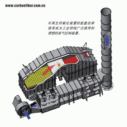 为了处理碳纤维生产过程中产生的废气,达到废气排放标准,Anguil公司已受委托设计、生产和安装了一套MS-DFTO装置。这种减排系统能够分解氧化过程中的主要副产物——小分子的氮氧化物NOx。通过调节工艺参数,可以使通过DFTO的挥发性有机物的分解率超过99%。